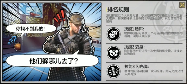 在“躲猫猫”模式里,战士们会被分为“人类方”和“物件方”。“人类方”战士需要搜索隐藏在地图中,并且伪装成某种道具的“物件方”战士,而“物件方”战士,则需要和“人类方”战士斗智斗勇,把自己藏在合理的地方,躲过搜查。