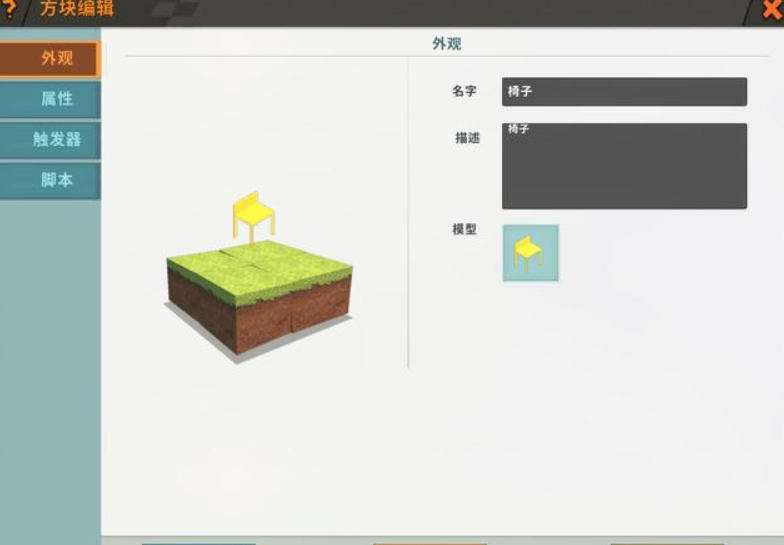 等创建好后,玩家将模型放入总库中,然后在插件库里利用模型创建出一个全新的方块,并将它插入回开发者地图中。例如,玩家可以先做出一个椅子模型,然新创建一个命名为椅子的方块。