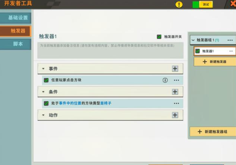 接着,玩家打开触发器,在事件中新增事件——玩家——点击方块时,条件——方块——方块类型。其中方块类型需要玩家从模型库中寻找到刚刚创建好的椅子方块进行选定。