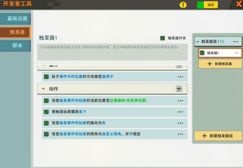 当然了,如果玩家要想更写实的话,还可以在动作里新增改变玩家视角或是改变玩家朝向的动作,让整套触发器看起来更贴近原版的椅子行为。