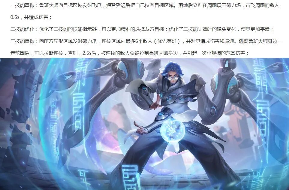 在本次体验服更新中,鲁班大师被重做了1/3技能,解决了被鲁班大师拉回后无法反制的问题,而新技能增加了一个位移,使得鲁班大师作战更灵活,且被2技能连接的队友也更灵活,相当于队友拥有了两个位移点。