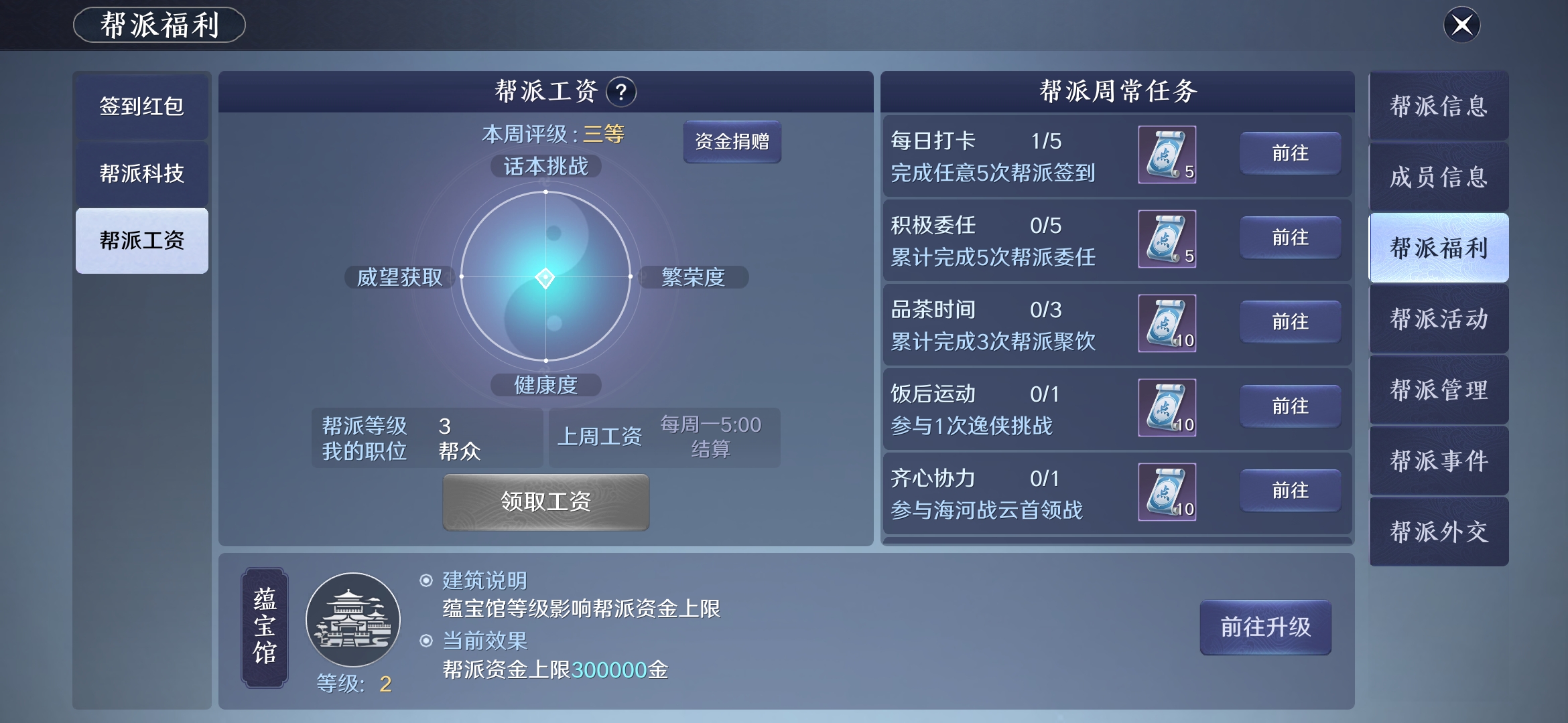 帮派工资是一项周常福利,工资每周一5点结算,但只有在结算钱加入帮派满3天的玩家可以领取。