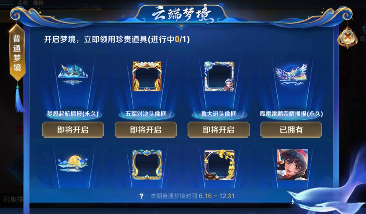原本普通梦境奖励定在30号结束,这次官方又提前对活动时间进行了延期,更改为持续至12月31号,不仅如此奖励列表也提前换新,新加入的永久荣耀播报名为梦想起航,而新增的三款相框分别是五军对决、鲁大班和狗年纪念头像框,喜欢收集相框的玩家可以等正式上架后前往活动面板领取,另外官方依旧保留了橘右京、娜可露露和不知火舞三位SNK英雄!