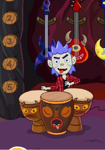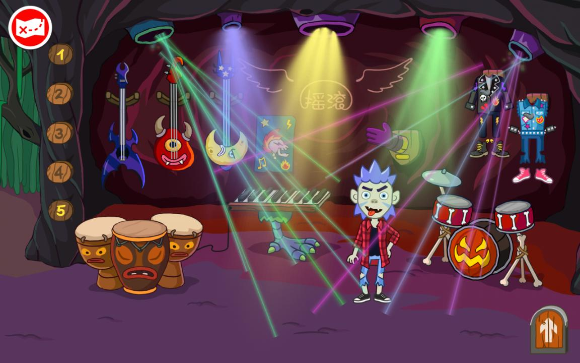女巫之家一层是男巫师的演唱会现场,这里有各种各样的乐器哦!你可以点击舞台左侧的按钮,随意切换灯光、烟雾效果呢。
