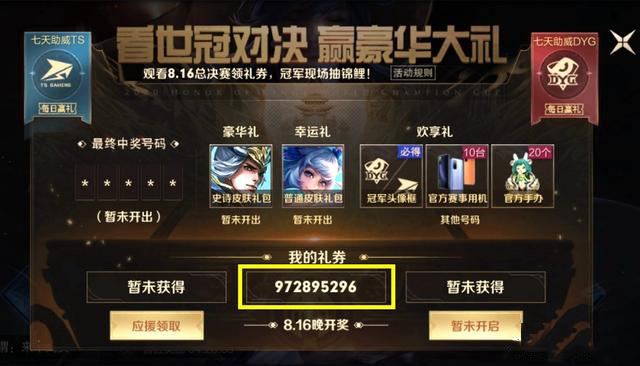 此次活动的参与方式很简单,玩家通过应援自己支持的战队或总决赛当天完成游戏内赛事观赛等任务,可以获得最多3张礼券,每张奖券为9个数字,而最终中奖的5个数字由夺冠战队选手抽出(16号晚上)。