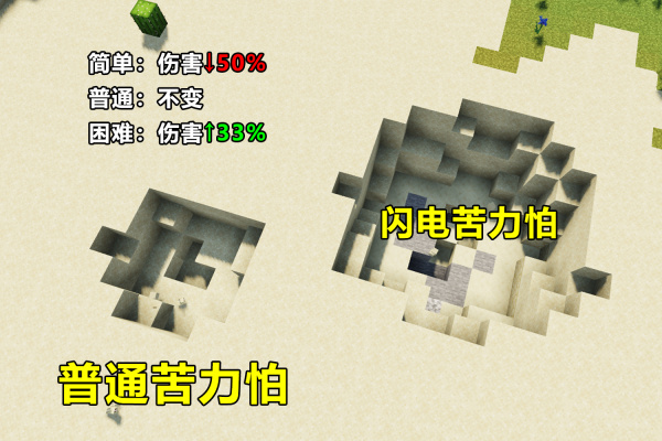 闪电苦力怕的威力相当于2只普通苦力怕,这里科普一下,当玩家距离苦力怕四格以内,即使你装备全套钻石盔甲,苦力怕也能把你炸到只有4点生命值!因为在困难模式下,它的伤害会得到33%的增幅,当然如果是闪电苦力怕,那么请点击“重生”按钮吧!