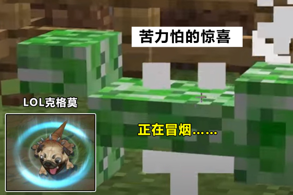 苦力怕在死亡时会出现浅绿色与白色交替闪烁的状态,并且伴随着阵阵白烟升起,经过短暂延迟便会爆炸(感觉像小时候扔出去的鞭炮) ,这一点与英雄联盟中的克格莫、俗称大嘴的英雄较为相似。但大嘴在死亡后的4秒内可以移动追击玩家,相比之下,此时的苦力怕还是太菜了!