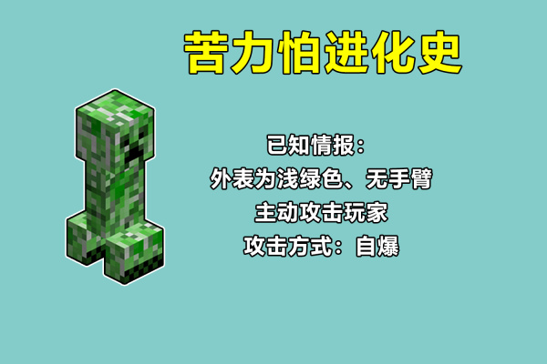 为了照顾一些刚接触《我的世界》的玩家,我们先来复习一下苦力怕的知识点,首先它的外表为浅绿色,属于敌对生物,会主动攻击玩家,而且只有一种方式:自爆!