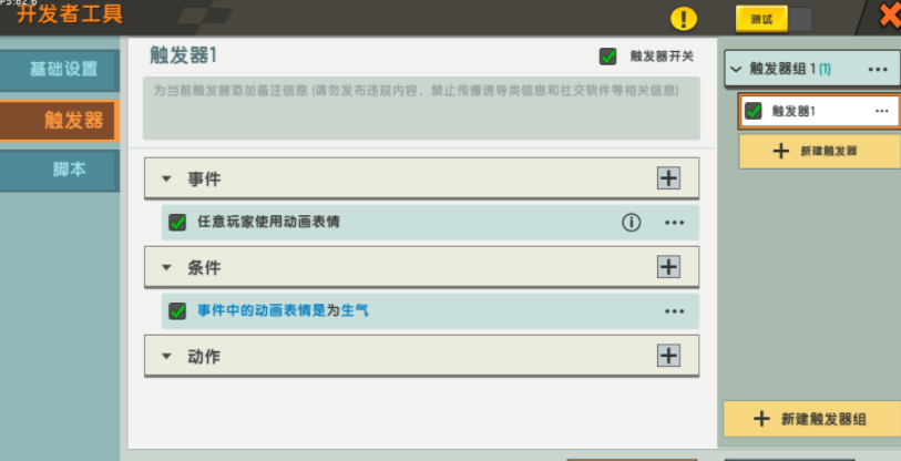 接下来进入到触发器中,开始设置投掷物飞剑的触发特效。触发器拥有“事件”“条件”“动作”,事件就代表着触发的具体设定,而条件是对事件中的设定类型加以限制,动作是触发设定后会出现的效果。 整体看上去很好理解,就是普通的因果关系。先来设置事件,进入其中选择玩家——任意玩家使用动画表情。随后在条件中将事件中的表情特定为生气。