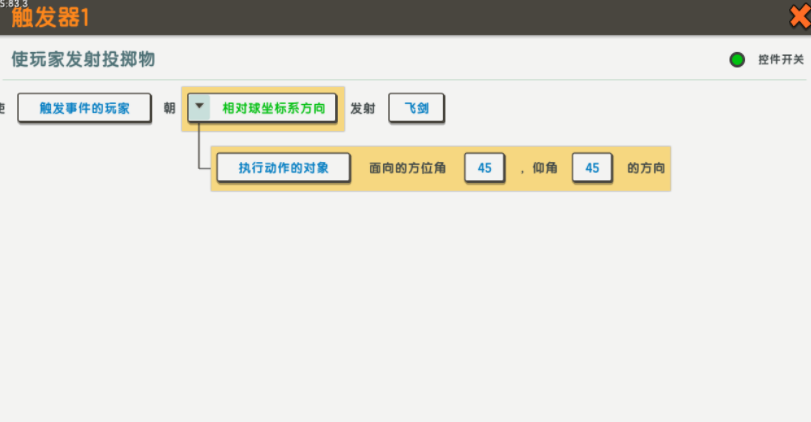 当前两项完成后,就可以开始第三项,也是十分重要的一点动作效果设置,选择道具列表,使玩家发射投掷物, 进入其中编辑具体的数据,方向一栏选择函数库——通用——相对球坐标系方向,投掷物栏选择刚才保存加载的飞剑! 在相对球坐标系方向下方会有需要填充的数据,第一个选择执行动作的对象,方位角代表着玩家前后左右的角度,而仰角代表着上下的角度。