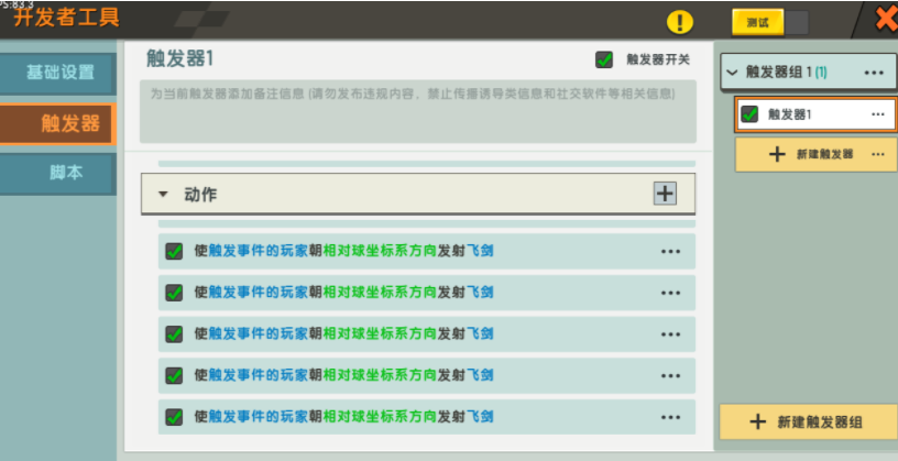 道具编辑分为三个,第一个是外观,可以直接给这个投掷物起名以及选择外观。外观自行选择模板,或者通过微缩模型工作台搭建模型。 第二个是属性,重力调整为5;出手速度调整为600;速度衰减调整为0.5。属性中作为投掷物选项关闭;可以拾回关闭; 第三技能选择可有可无,无非就是给投掷物增加一些效果,例如治疗目标、击飞目标等等,玩家可以根据实际需要选择。此时保存并返回,同时将新建的飞行物加载进地图之中。 触发器飞剑选择