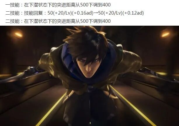 澜削弱:下潜状态的突进距离缩短,2技能回血量降低。