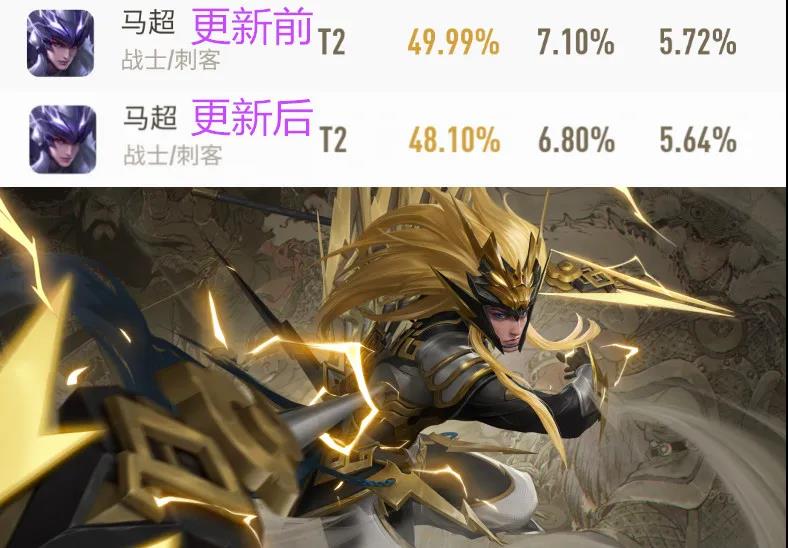 马超由于削弱了被动回血量,导致排位胜率从49.99%下跌至48.10%,但其依旧是高分段强势英雄,在巅峰赛中热度排名第一,胜率排名第五。