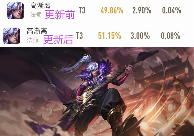 高渐离由于简化了被动触发条件,排位胜率从49.86%上涨至51.15%,目前这英雄坦度较高,但伤害有些欠缺,不具备主流法师的爆发输出,所以在本赛季中依旧不温不火。
