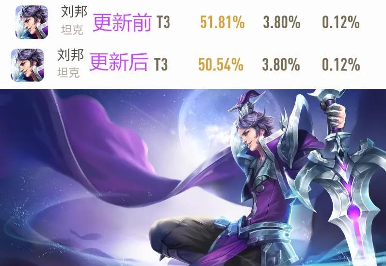 刘邦由于削弱了大招,其胜率从51.81%下跌至50.54%,目前刘邦已经算不上主流坦克,其排位表现在本赛季实属一般。