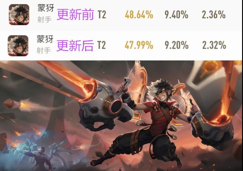 蒙犽由于削弱了2技能消耗能力,导致其排位胜率从48.64%下跌至47.99%,蒙犽在本赛季的表现也很一般。