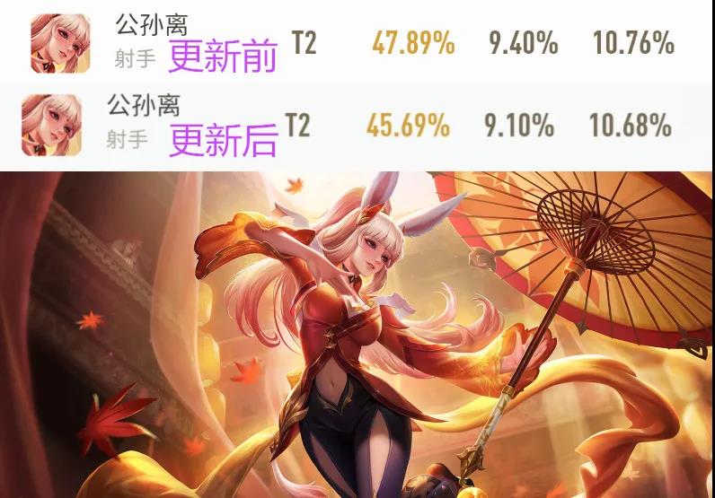 公孙离由于被动伤害被削弱,排位胜率从47.89%下跌至45.69%,目前在英雄榜上胜率垫底,刚好替代了芈月之前的位置。