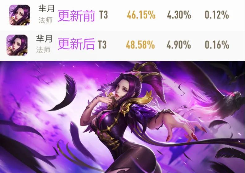 芈月由于1/2技能被加强,排位胜率从46.15%大涨至48.58%,有望突破50%,而在巅峰赛中的胜率甚至高达52.62%,喜欢的玩家可以去尝试一下,说不定有意外惊喜。