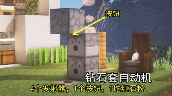 最后一步仅需在头部的发射器之下,通过“潜行键”放置一枚任意材质的按钮,脚部的发射器上撒下一点红石粉即可,玩家只需要轻轻一按便可实现秒换装备的功能,可以说是居家必备!