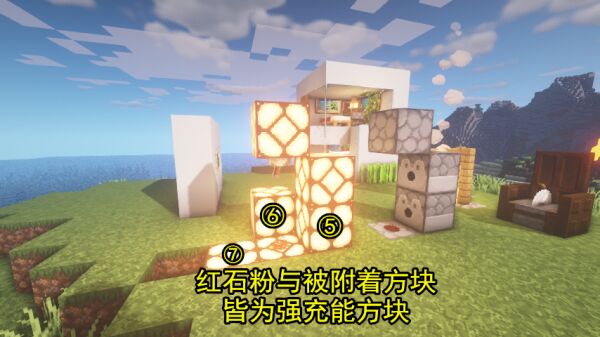 只需要如图所示,在底部的发射器上放置【点状红石粉】,该红石粉所占的空间与附着的方块都将会被强充能,对其身边的方块提供红石能量,对应图中的红石灯便是——5号和6号因被红石粉充能,7号则是被红石粉附着的红石灯充能。