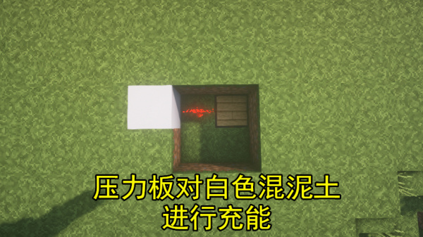 然后在深一格处放置一个云杉木栅栏,并倒入一桶【河豚桶】这个很重要,别的鱼都不行,切记!然后再放置一块压力板在其上,并撒下红石粉。压力板一旦被触发,红石能量将会通过红石粉对左侧白色混泥土进行充能。