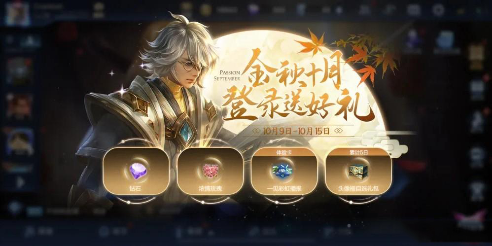 一、从9号开始的一周内,所以玩家累计登录5天可以获得钻石、浓情玫瑰、新播报体验卡和金秋头像框自选宝箱,其中相框自选宝箱内含玄雍防线、天美Timi、乘风破浪三款相框,适合相框收集控玩家参与,若全拥有的玩家可选择兑换50钻石!