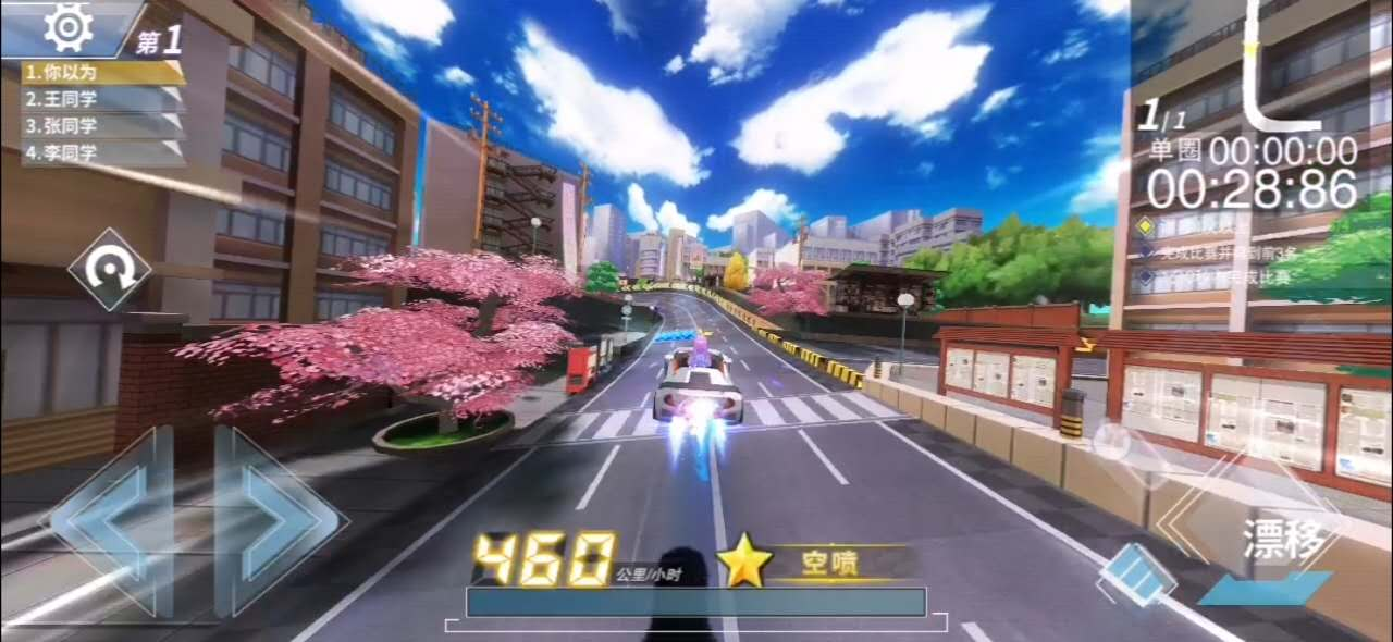 【空喷】 :在赛道上有些路段是需要赛车进行飞跃完成的,而在飞跃的过程中,赛车会有一个在空中飞行的状态,此时会触发小喷功能,点击小喷按钮则会在空中进行一次空喷,来延长赛车在空中的滑行距离,至此就能完成一次完美的空喷了。