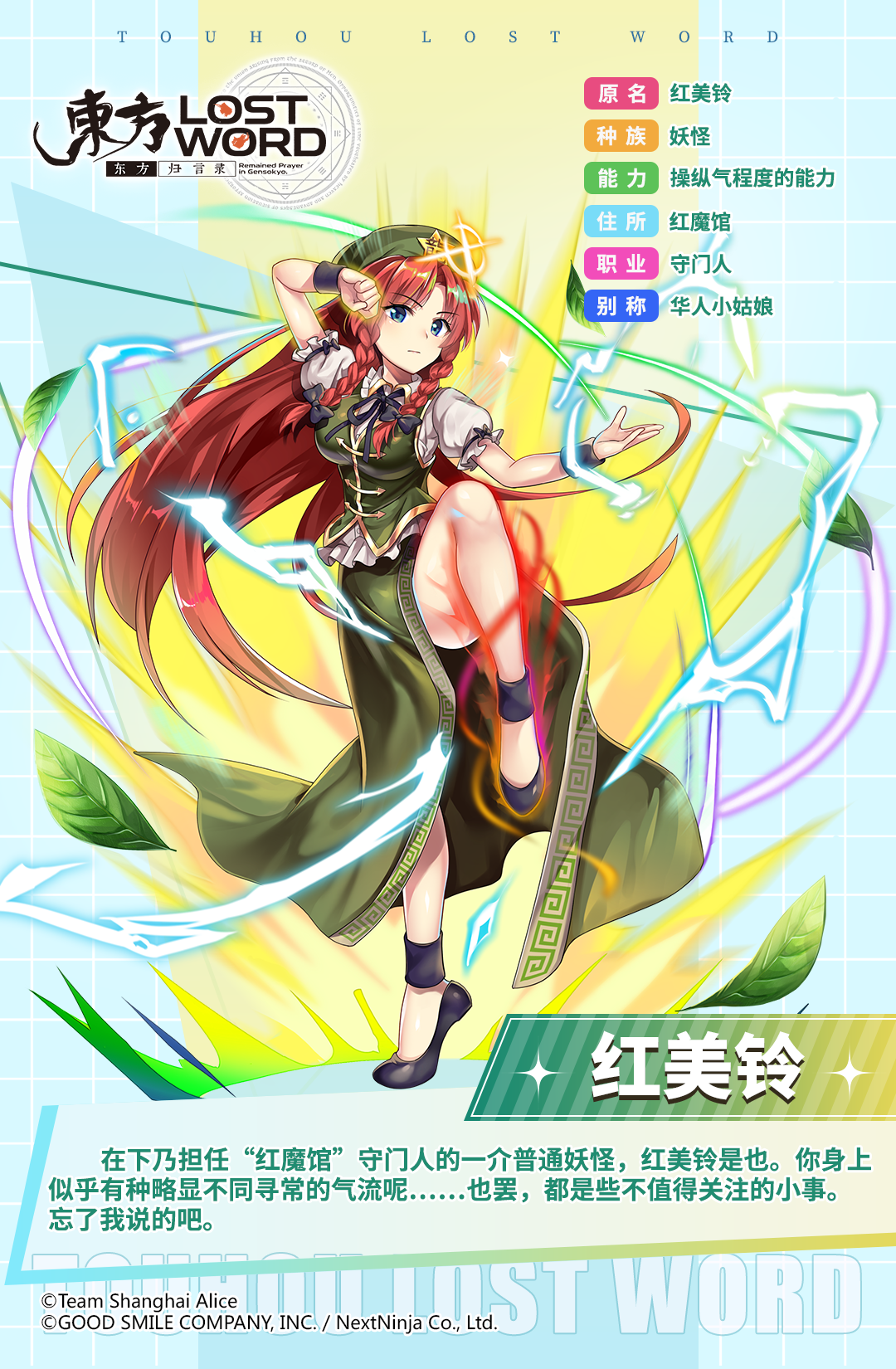 在下乃担任“红魔馆”守门人的一介普通妖怪,红美铃是也。你身上似乎有种略显不同寻常的气流呢……也罢,都是些不值得关注的小事。忘了我说的吧。