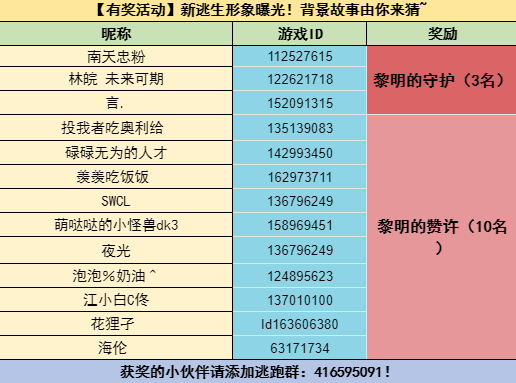 请以上获奖的20位玩家三天内加入233逃跑吧少年交流群联系管理员极夜确认你的游戏ID,以便于奖励能发放正确!