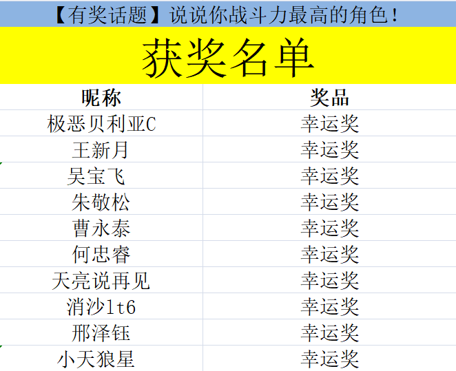 恭喜以上10位玩家获得咱们本次活动的幸运奖,请以上10位玩家在4月15日前联系233官方工作人员进行领奖。(逾期奖品将作废)