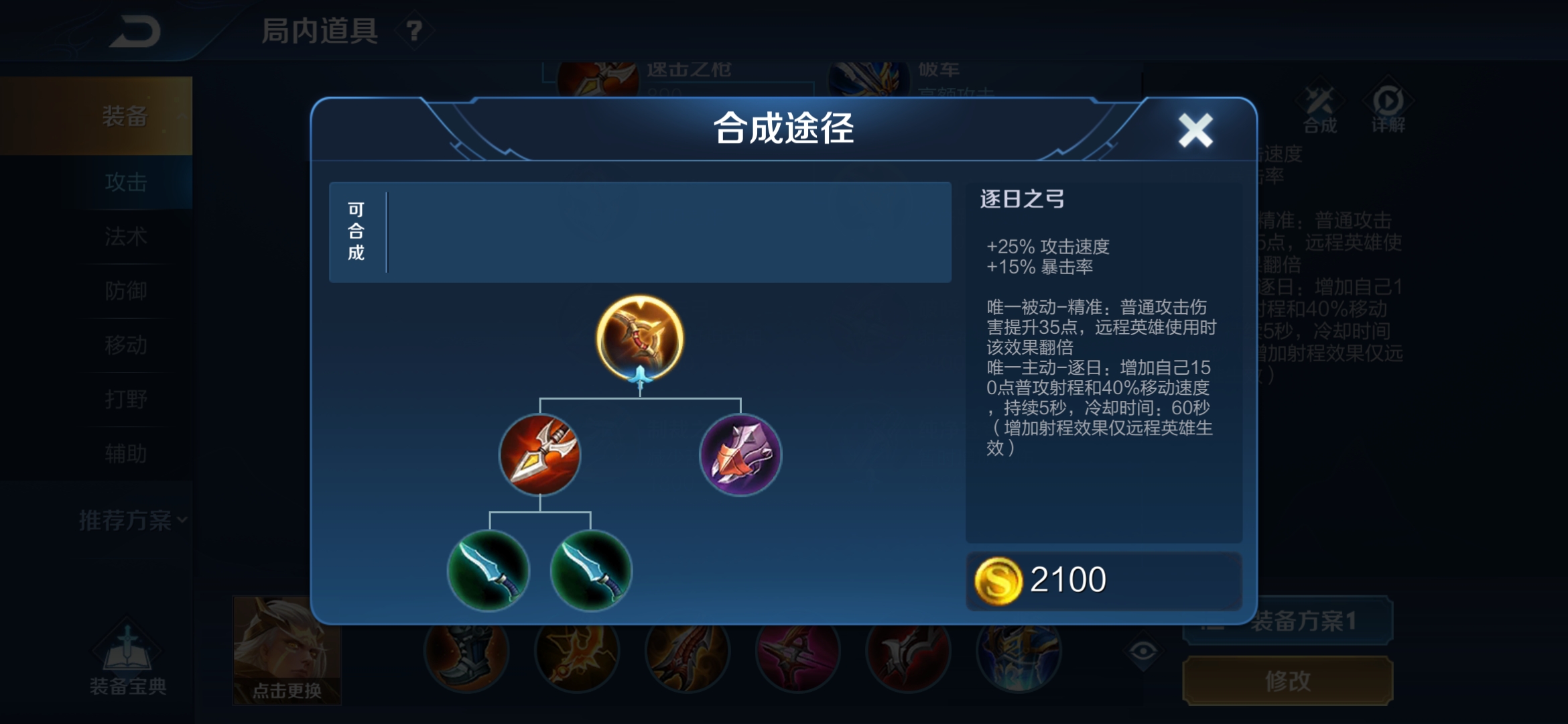 合成无尽后,就是“鲸吞流”后羿最为核心的装备了,它就是逐日之弓。逐日的主动开启后,能同时提供150点额外射程和40%的移动速度,要知道,后羿缺乏位移技能,在团战时,很容易就会被敌方刺客击杀。有了逐日的主动技能,后羿在团战时能无视刺客。