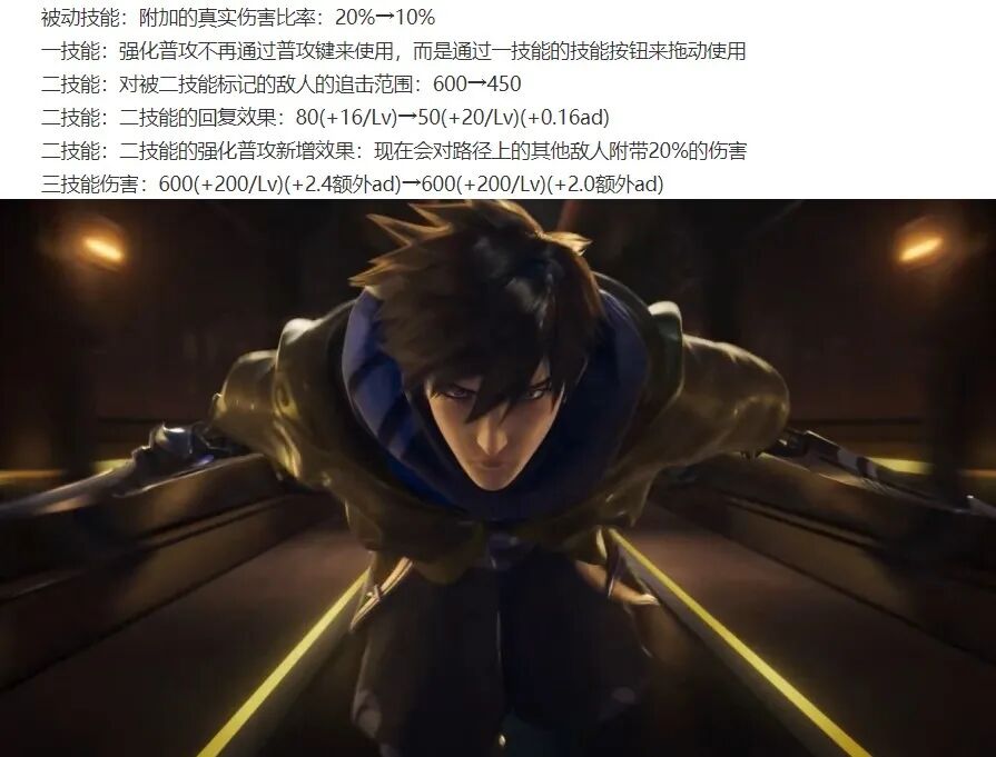 澜大幅调整:被动伤害降低,1技能新增第二段自主位移,2技能追击范围缩小,2技能回血量增高,2技能新增路径伤害,大招伤害降低。