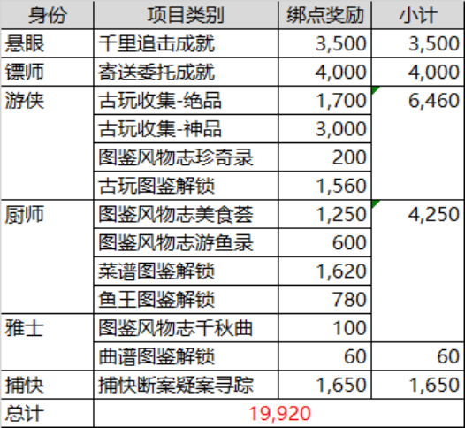 再比如说厨师和雅士身份主要通过解锁图鉴来获得绑点,捕快则是完成捕快断案中的疑案寻踪获得绑点。