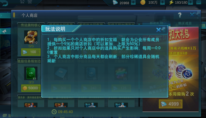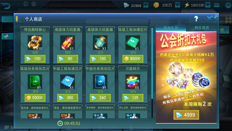 当然除了个人商店还有折扣礼包可以购买,折扣礼包每周可以购买两次,每次购买还可以为公会所有小伙伴提供5%的个人商店打折,上线是50%,当然这样的折扣每周一也会重置的。并且折扣礼包也是非常划算的,每个公会礼包都拥有4星皮肤*1,等离子精魄*1万,传说英雄选择器*80,这样的奖励已经不是丰富可以形容了吧,简直就是豪华,单说80传说英雄选择器价值救已经远远大于5000钻石了,更何况还有皮肤升阶卷这样的稀有物品。