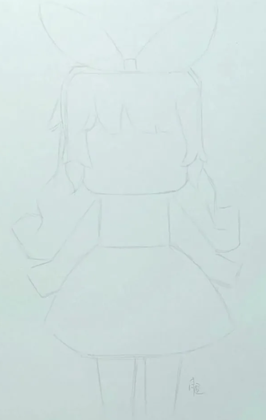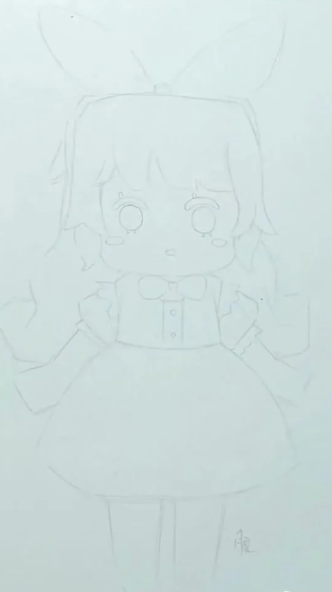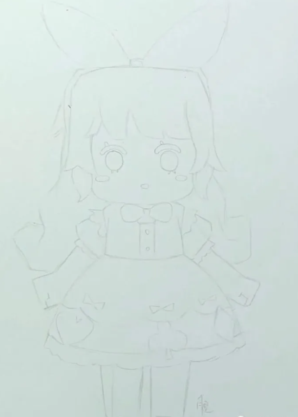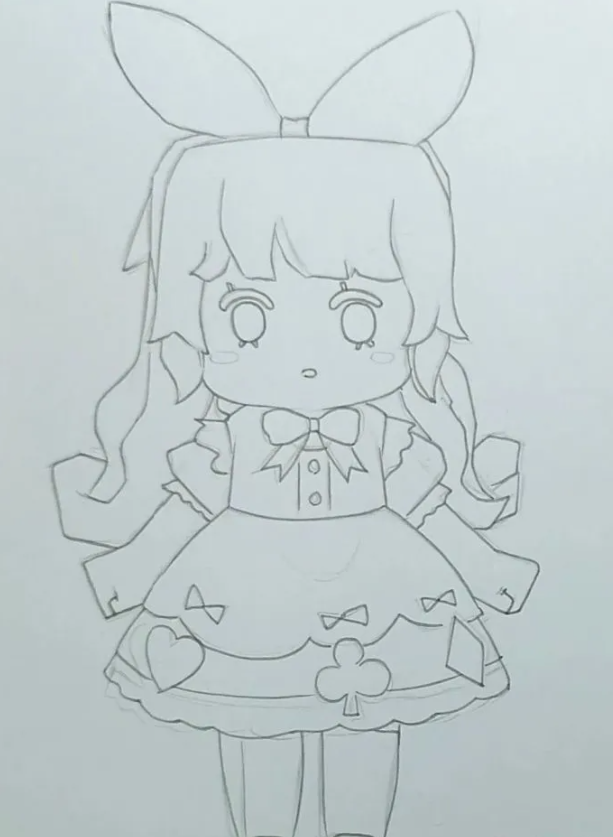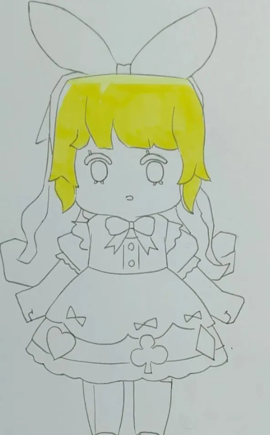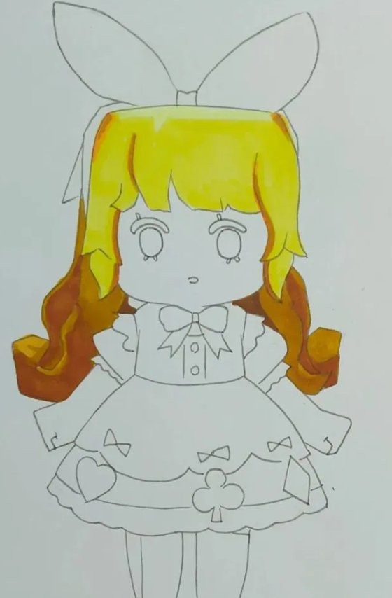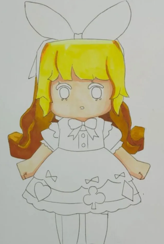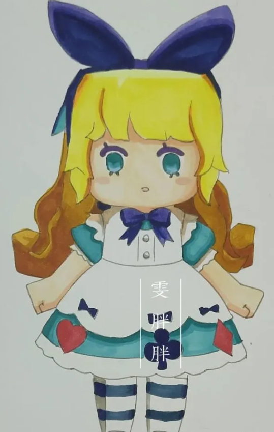 马克笔颜色不多,所以蝴蝶结的颜色不一定准确。有两个层次,一个浅一个深,要画出体积感。这样,可爱呆萌的爱丽丝就画好了。
