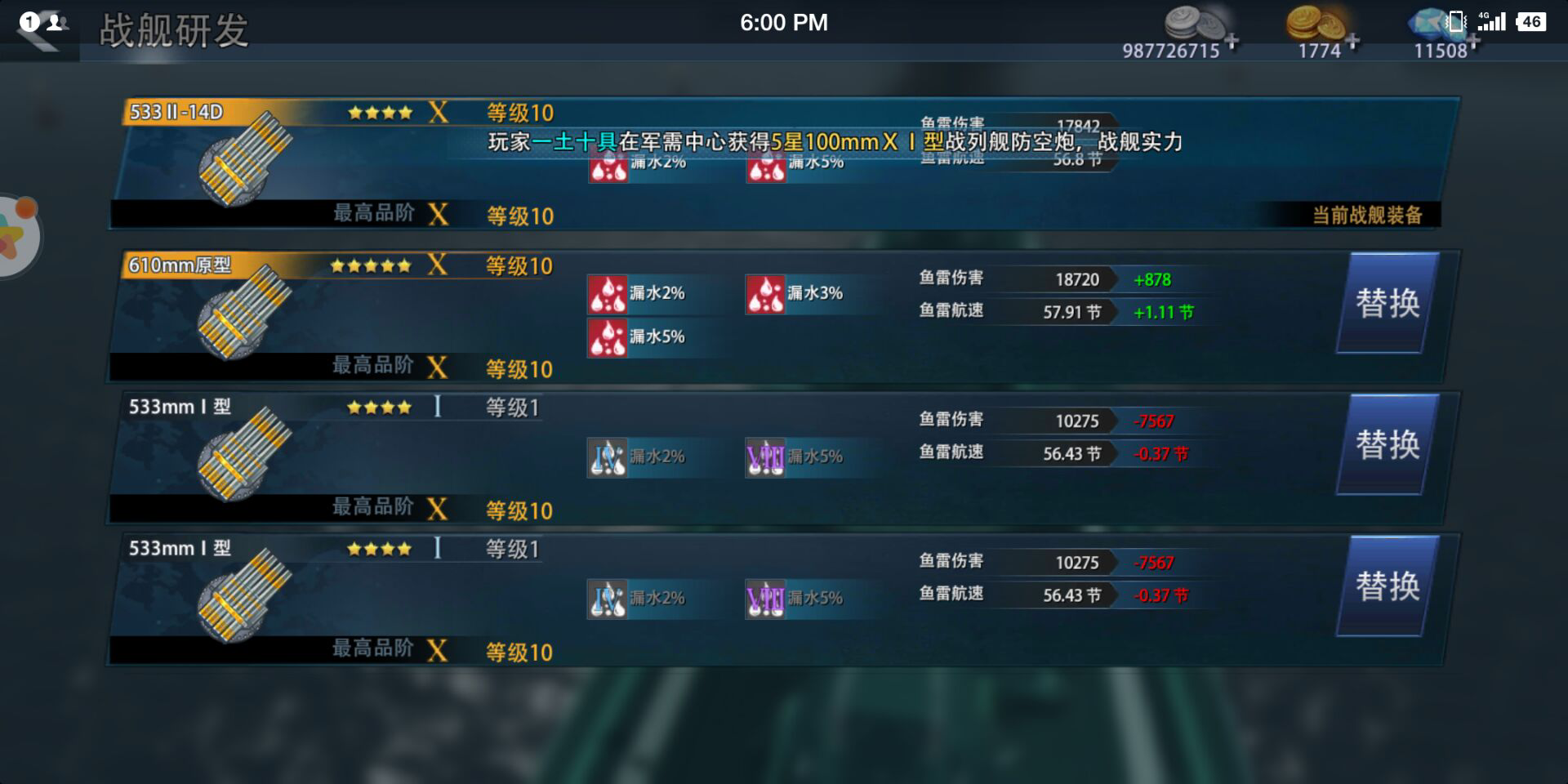 橙色无改610mm原型鱼雷和四星舰队鱼雷数据对比(建议等战列武器特卖活动再弄,14000的价格比直接平时买要便宜一截)