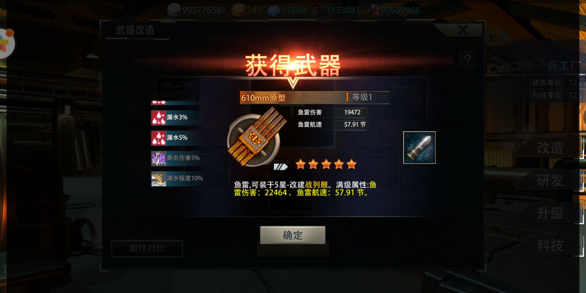 鱼雷额外属性:鱼雷速度+5节,鱼雷暴击概率+2%,暴击伤害+20%