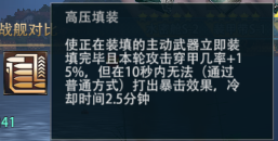 不过这个技能个人感觉可以有个很好玩的调整,修改为高压填装可以同时填装没有冷却的全部武器,这样41的牙签雷对于潜艇能够有更大的压力,也可以快乐副炮,连续两轮防空吓小朋友飞机了。