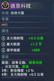 ,+3航速作用在天梯战列中也不明显,在我看来这个技能甚至不适用于现在的无尽模式,毕竟现在无尽有宗师模式只要玩家解锁那么基本都是21起步,除去21关有小怪以外其他关最脆的都是以十万血计数,h41想触发自己这个三号技能难度不亚于天梯模式,也就常规人机局杀杀血量四万顶天到不了五万的人机,一轮一个小朋友血量+3%能多站一会,我个人暂时感觉不到这个技能的实战意义。作为战列舰,其实我个人更希望德意志的黑科技能和现在比较nb比较恶心人的维护降效效果结合一下,在3号技能原先的基础上和四号技能达成连携,由高压填装后的炮弹命中/或是在触发嗜血狂飙过程中的命中打出穿甲,被命中对手的维护效率-1%,损毁后重置,类似这样的技能强化h41在天梯中的战斗能力,提升不大也不会影响平衡。目前h41的三号技能是个打常规的技能,然而麦子在人机局有机关枪副炮,锤人机效果要好过h41(可能没有41爽)