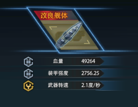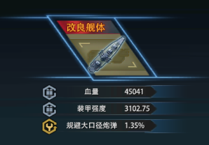 舰体这边首选武器转速,容易刷到,容易升级,升级效果好,41作为四炮战列武器转速本就不出色,想起密苏里那个不刷武器转速一转向主炮转速就跟不上船体准星脱离屏幕中心的样子,哪怕刷新的过程中给了我规避大口径炮弹之类的我也不会要!(明明就是你脸黑刷不出)
