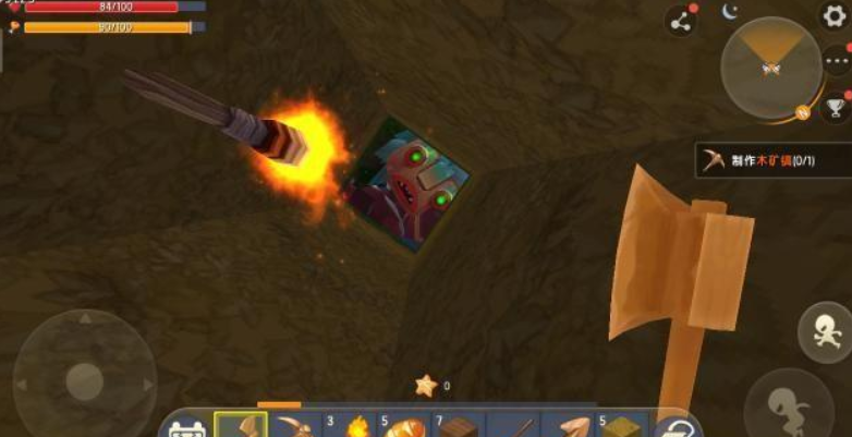 我们制作好木镐开始在土地上向下挖洞的时候,成功挖到了石头,可危险也随之来临了!左上角的红色条条是生命条,它正在慢慢的减少!