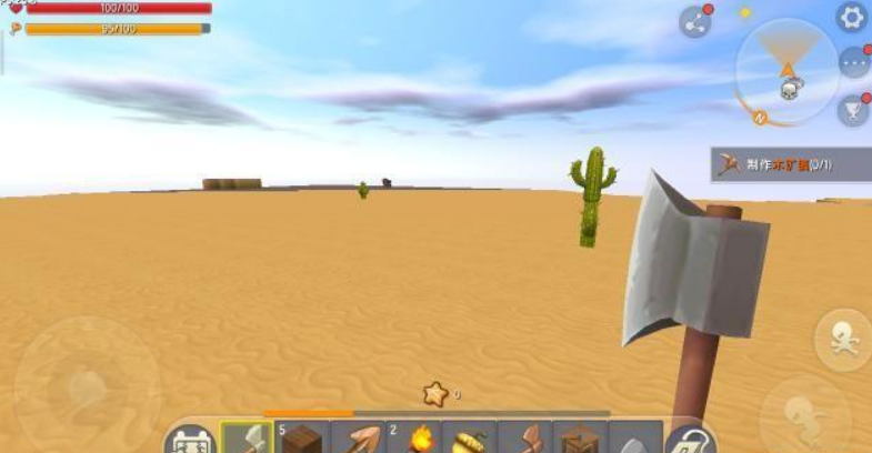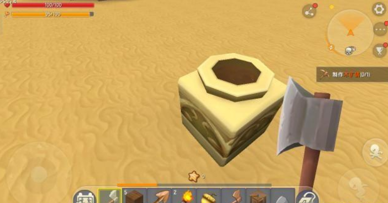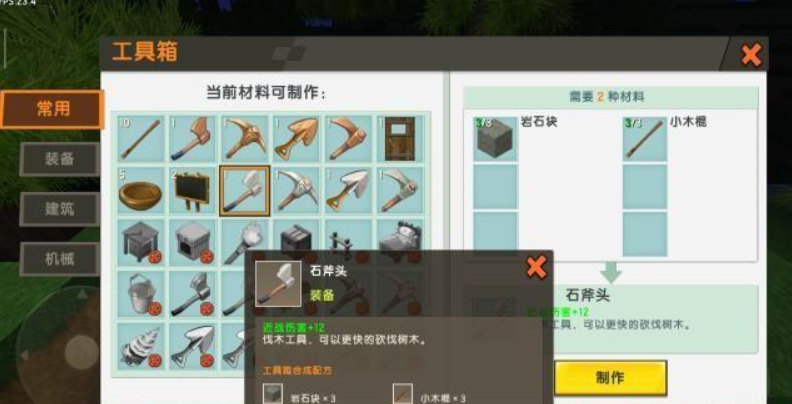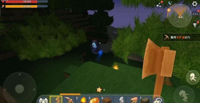 挖到足够多的石头之后,就慢慢的向自己的身下垫刚刚挖到的土块,然后就可以慢慢上去了。有了石头后的第一时间就赶紧去刚刚制造好的工具箱那里造了一把石头斧子,石头斧子比木头斧子砍树更快哦!在黎明之前要看到足够多的树木,为接下来的探险做准备!