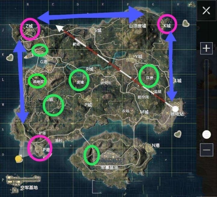第三点,说到打野转移,那么具体怎么打野,路线是什么。还看上图,蓝色线标注的。举例说明,假如第一个圈偏左上↖,那就跳K城/P港,迅速发育找车,沿蓝色剪头方向开车/开船进圈。这里如果物资搜差不多了建议开船,安全不说,也能观赏一下沿途的风景,让你在紧张刺激的游戏中得到短暂的放松 。假如安全区是中间,就跳绿色圈标注的地点,视具体情况打野发育。