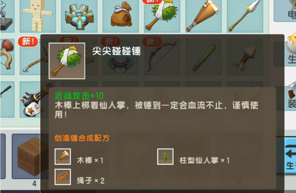 首先是尖尖碰碰锤,这是一把近战武器,攻击力仅有10,战力不算太高,但它的被动很强,附加流血效果,可以作为前期的过渡武器。新武器制造起来也比较容易,玩家只需要找到1根木棒、两条绳子以及一个柱型仙人掌,尖尖碰碰锤就能被合成,相较于普通的铁剑武器,这把装备附带流血效果,使用起来更方便。