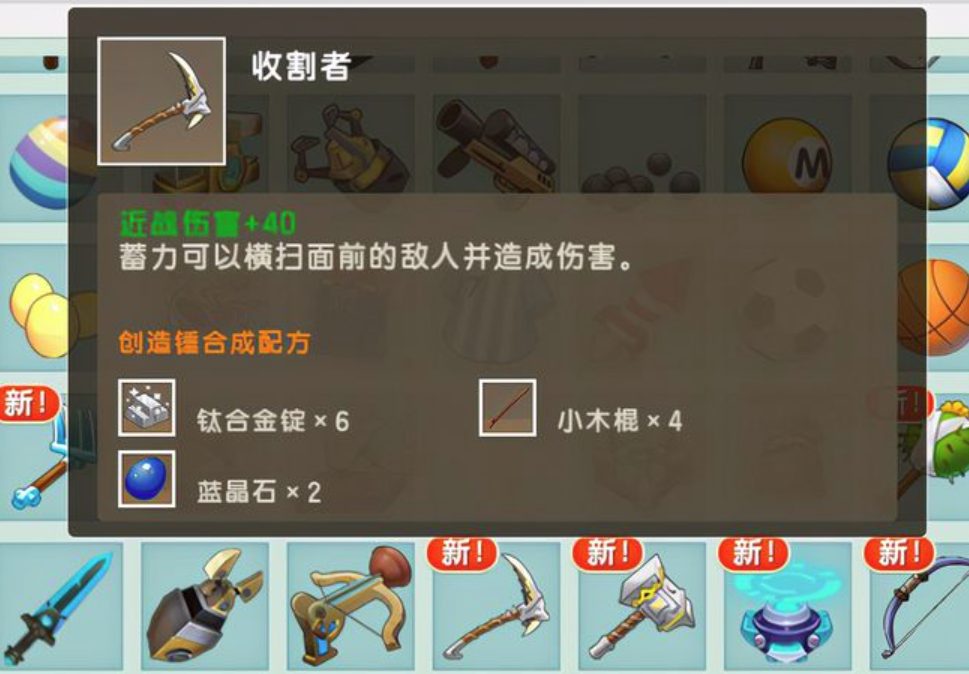 其次就是收割者,这也是一把近战武器,伤害客观,高达40,而且武器还可以进行蓄力,对面前的敌人造成伤害,这把武器能让玩家实现一打多的局面。不过,这把武器制造起来稍显麻烦,需要全新的资源钛合金矿,还需要蓝晶石2个以及小木棍4个,集齐了这些材料就能合成,由于武器战力比较高,建议玩家去合成。