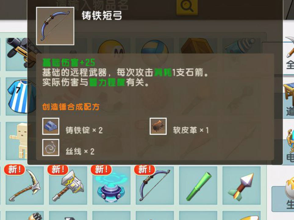 最后就是铸铁短弓,上一个版本玩家还只能使用木弓,打起来比较费劲,新版本出现了铁弓,攻击力更强,基础伤害就有25,如果蓄力时间上,伤害也会增强,作为远程武器,这是玩家必做的装备。可惜,这把武器制造难度大,不是说材料不好找,前期个人玩家不一定能体验到。