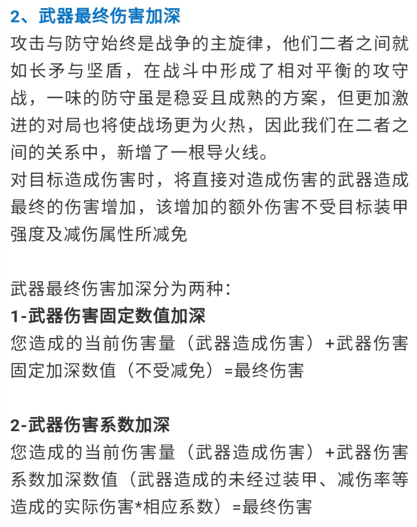 武器最终伤害加深,相信有不少指挥官看得云里雾里,笔者将其解读为追加伤害。简单来说,就是武器追加准真伤,即不受减伤率影响。预计会有两种方向,一种是固定准真伤(如+100),另一种是百分比准真伤(如+1%)。