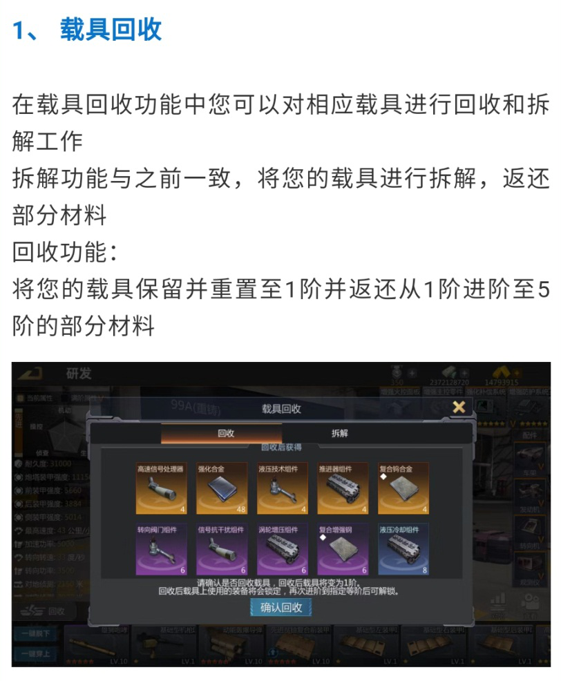 回收功能不必多说,对于一些升阶之后感到后悔的、但是又不能拆的载具,就可以回收了。不过还是提醒各位指挥官,避免过多地研发、升阶、回收、拆解载具,这对材料的消耗还是比较大的。