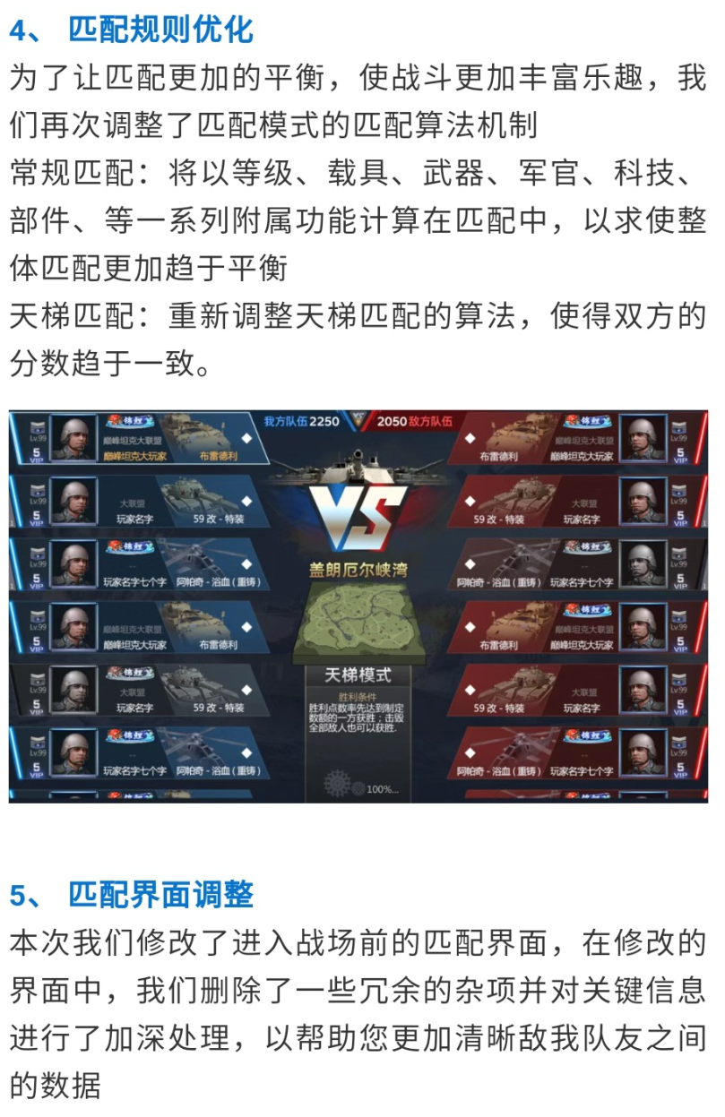 匹配机制是众多指挥官关心的问题,本次更新也进行了优化,不过不少指挥官反馈说,本次匹配机制的优化很鸡肋……具体来说就是双方的装备配置不平衡、单排玩家被组队玩家屠杀等等的问题仍然存在。路漫漫其修远兮,这点我们只能等待后续优化了,不过我们看到了官方的努力,总体还是给予肯定和支持~