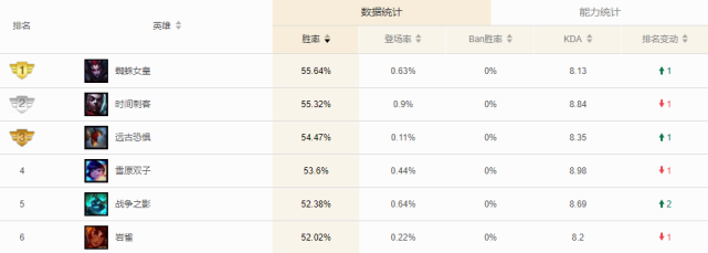由于AD刺客类装备的削弱,AP打野成为了版本的答案,其中蜘蛛更是以55.64%的胜率成功登顶。蜘蛛作为一个比较吃操作的英雄,在这个版本能够登顶足以说明她的强度是非常高的。